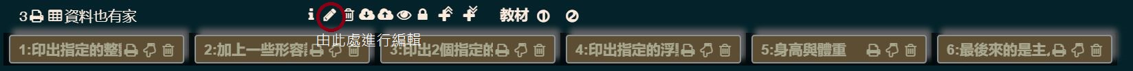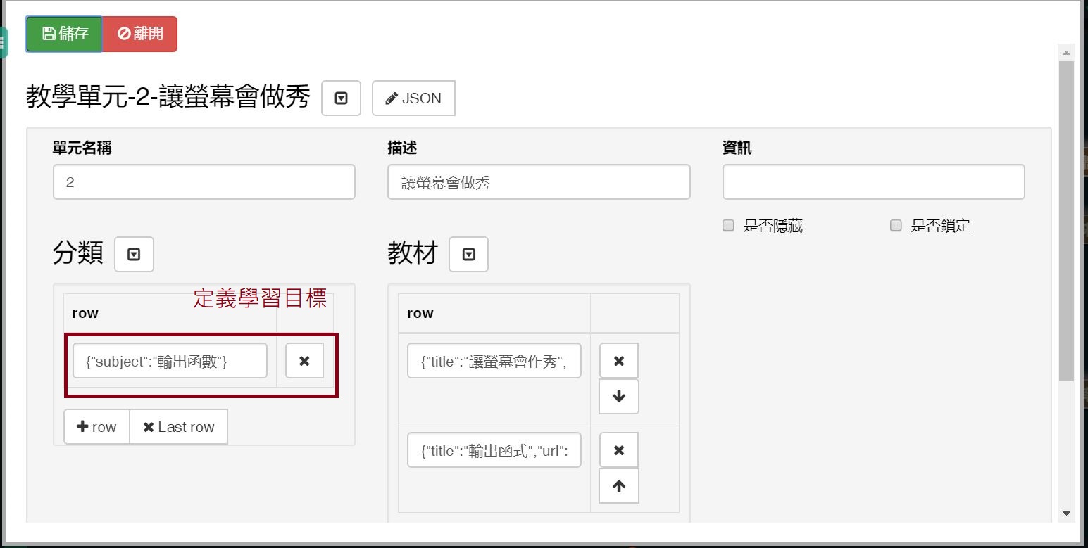 編輯學習目標:請定義各單元的學習目標。以資料也有家單元為例 可以以此定義學習目標:{"subject":"變數宣告"}